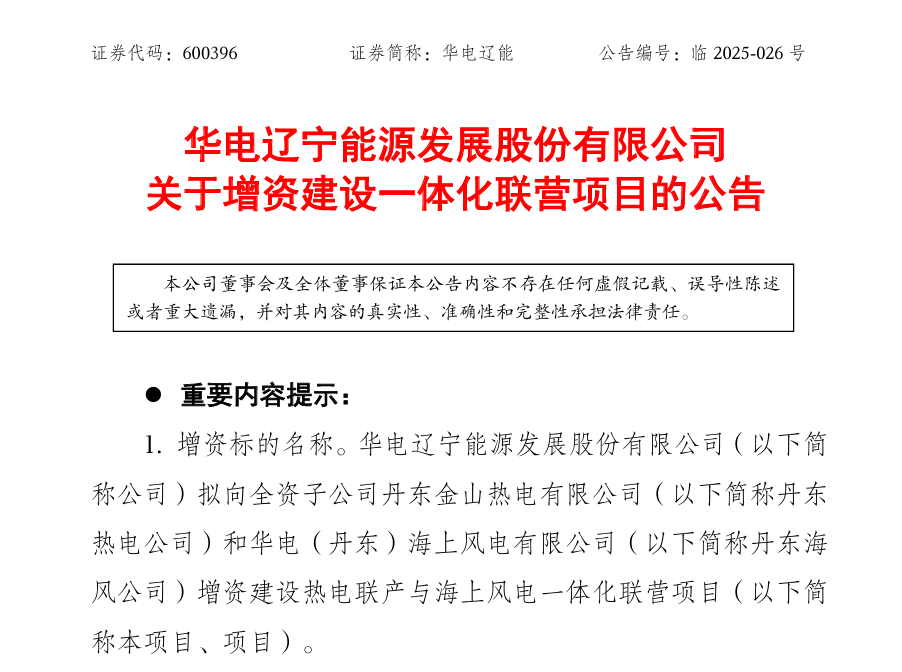 8月19日,华电辽宁能源发展股份有限公司(以下简称“华电辽能”或“公司”)发布《关于增资建设一体化联营项目的公告》。