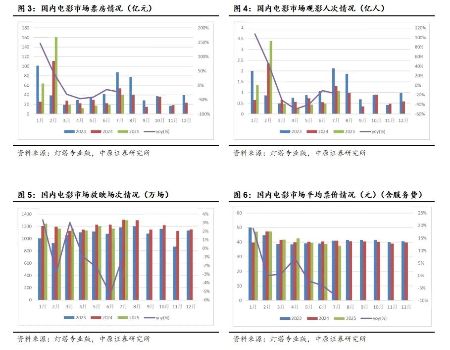 2025年7月,国内电影市场票房40.67亿元,同比减少24.38%,环比增加113.16%;观影人次1.08亿,同比减少17.56%,环比增加120.41;平均票价37.66元,同比下滑8.27%,环比下滑3.29%;放映场次1299.4万场,同比减少0.57%,环比增加6.64%;整体上座率6.7%,同比下滑1.6pct,环比提升3.2pct。