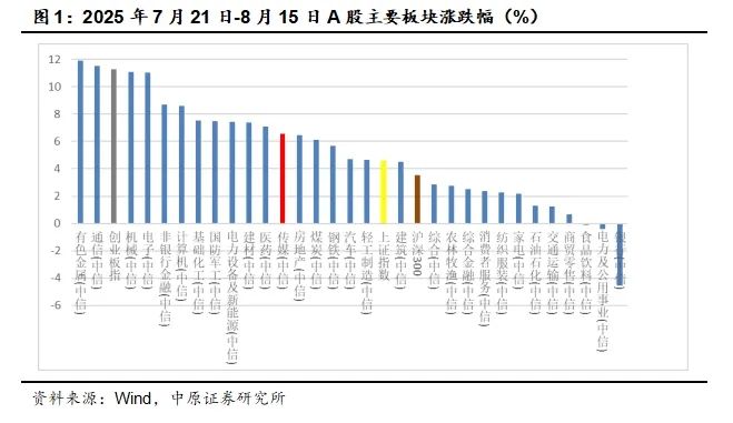 2025年7月21日-8月15日之间,传媒板块上涨6.56%,同期创业板上涨11.29%,上证指数上涨4.59%,沪深300指数上涨3.54%。在全行业涨跌幅排名中,传媒板块排在第12位。