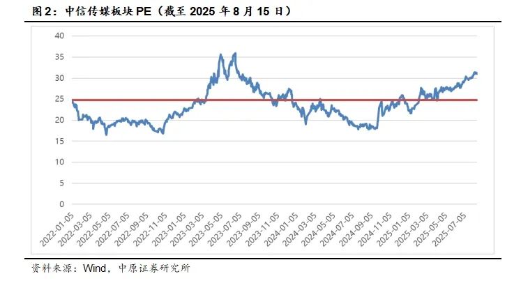 截至2025年8月15日,传媒板块PE(ttm,整体法,剔除负值)为31.11倍,2022年以来板块平均市盈率23.70倍,中位数23.10倍,最大值35.98倍,最小值16.46倍,当前PE历史分位为95.4%。