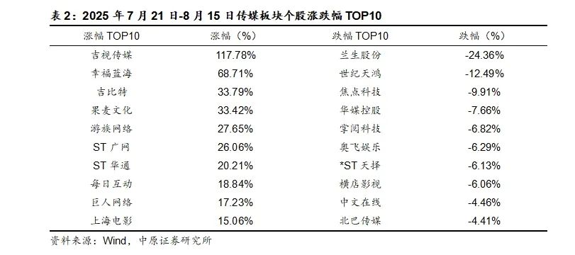 7月21日-8月15日,板块141只个股中94只上涨,3只持平,44只下跌。涨幅最高的有吉视传媒、幸福蓝海、吉比特、果麦文化、游族网络、ST广网、ST华通、每日互动、巨人网络、上海电影;跌幅最高的有兰生股份、世纪天鸿、焦点科技、华媒控股、掌阅科技、奥飞娱乐、*ST天择、横店影视、中文在线、北巴传媒。