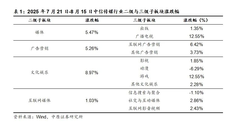 行情回顾与估值表现:2025年7月21日-8月15日之间,传媒板块上涨6.56%,同期创业板上涨11.29%,上证指数上涨4.59%,沪深300指数上涨3.54%。在全行业涨跌幅排名中,传媒板块排在第12位。