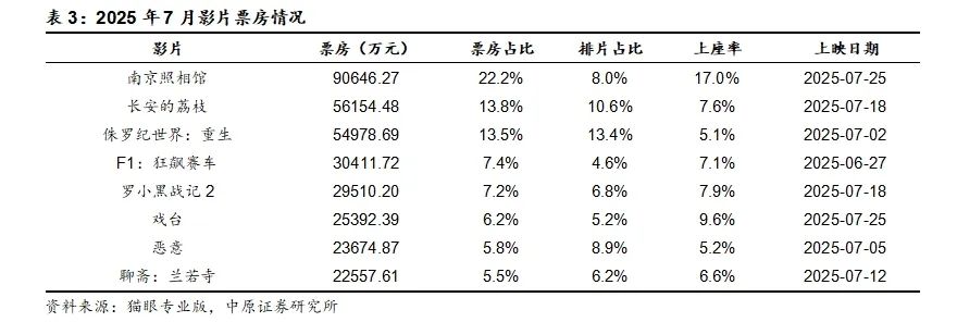2025年7月票房排名前三的影片分别是《南京照相馆》《长安的荔枝》《侏罗纪世界:重生》,单月票房分别为9.06亿元、5.61亿元、5.50亿元,票房占比分别为22.2%、13.8%、13.5%,排片占比分别为8.0%、10.6%、13.4%。