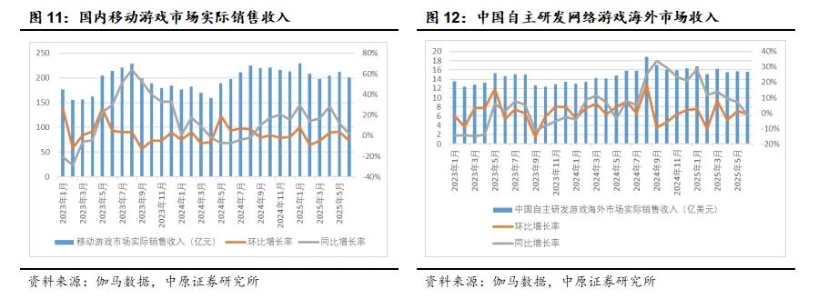游戏:基本面与政策面共振,AI有望提振估值。2025H1国内游戏市场规模与用户数据再创新高,行业需求表现稳固,地方对于游戏产业扶持鼓励的政策频出。在AI应用端,目前AI技术在游戏产业的应用较为明朗,不仅限于制作发行流程环节的降本增效,AI NPC、AI+UGC、AI陪伴等更能体现AI技术智能化、个性化的游戏应用或游戏化应用已有产品雏形,预计未来将有更多基于AI技术赋能的AI原生游戏出现,帮助游戏行业实现价值重估。关注后续游戏公司新产品上线节奏。