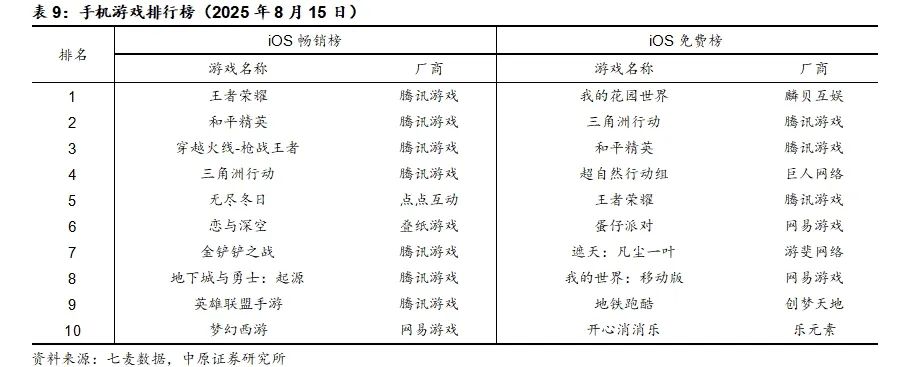 根据七麦数据统计的2025年8月15日iOS畅销榜游戏排行中,《王者荣耀》《和平精英》《穿越火线-枪战王者》《三角洲行动》《无尽冬日》排名前五。iOS免费榜中,《我的花园世界》《三角洲行动》《和平精英》《超自然行动组》《王者荣耀》排名前五。