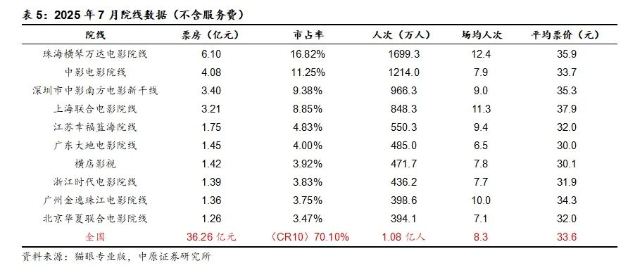 2025年7月,珠海横琴万达电影院线票房6.10亿元,市场占有率16.82%,环比下滑0.72pct;中影电影院线票房4.08亿,市场占有率11.25%,环比提升0.81pct;深圳市中影南方电影新干线票房3.40亿元,市场占有率9.38%,环比提升0.05pct。