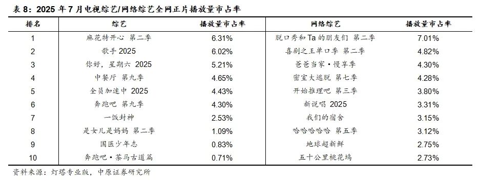 根据灯塔专业版统计的2025年7月全网正片播放市占率,电视综艺排名前五的分别是《麻花特开心 第二季》《歌手2025》《你好,星期六 2025》《中餐厅 第九季》《全员加速中2025》;网络综艺排名前五的分别是《脱口秀和Ta的朋友们 第二季》《喜剧之王单口季 第二季》《爸爸当家·慢享季》《密室大逃脱 第七季》《开始推理吧 第三季》。