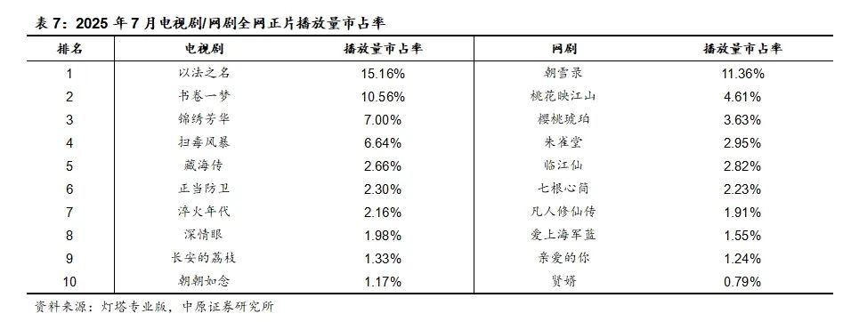 根据灯塔专业版统计的2025年7月全网正片播放量,电视剧排名前五的分别是《以法之名》《书卷一梦》《锦绣芳华》《扫毒风暴》《藏海传》;网剧排名前五的分别是《朝雪录》《桃花映江山》《樱桃琥珀》《朱雀堂》《临江仙》。