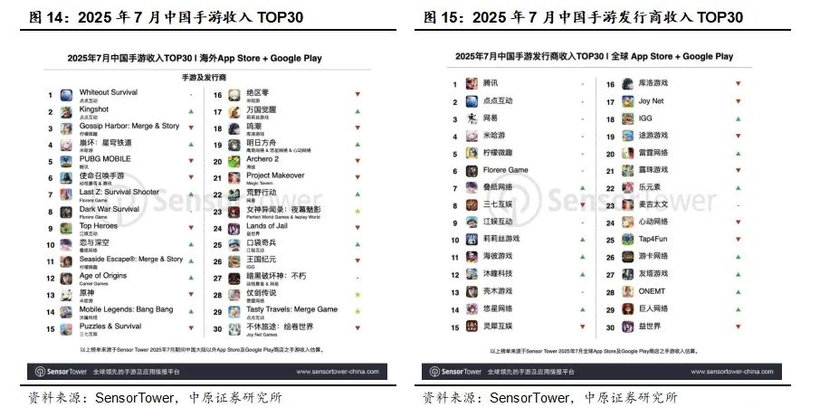 根据SensorTower数据显示,2025年7月中国手游收入TOP30中,《Whiteout Survival》《Kingshot》《Gossip Harbor: Merge& Story》《崩坏:星穹铁道》《PUBG MOBILE》排名前五。