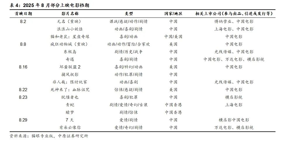 影视:暑期档进入尾声,档期票房超百亿,观影需求得到有效释放,预计暑期档最终票房将与2024年持平。建议关注影片后续的票房表现以及对Q3影视板块业绩的影响,同时建议关注部分影视公司拓展IP衍生品业务的进展。此外,对于影视剧内容创作、内容引进、制播模式的监管政策的改善能够进一步优化国产影视内容的吸引力,优化影视剧公司盈利能力。