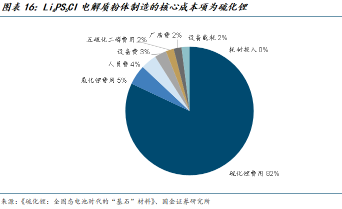 硫化锂始终作为必备核心原料组分参与材料体系构建,未来需求有望快速增长。虽然硫化物固态电解质材料种类丰富,但通过材料体系溯源分析可以发现不论是在哪种体系中硫化锂都是其中的核心原料。《硫化锂:全固态电池时代的“基石”材料》一文中,以Li6PS5CI粗粉电解质体系为例的实证分析显示,硫化锂在材料体系中质量占比达43%,而当前公斤级市场报价波动于5000-10000元区间。基于吨级Li6PS5CI产线的成本敏感性分析,硫化锂的原料成本构成比高达82%,这一数值直观印证其作为核心成本项的产业地位,未来随着硫化物电池的出货增长将直接拉动对硫化锂的需求快速向上。按照我国政府对硫化物全固态电池的产业规划,2027年硫化物全固态电池将装车3000辆,实现小规模量产。据此估算,基准场景下电解质需求量约300-500吨量级,对应产生100-200吨级硫化锂原材料需求基数,叠加应用发展带动的市场需求,硫化物全固态电池关键材料市场容量预计呈现数量级跃升。
