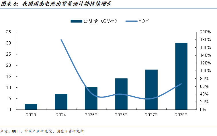 目前固态电池正处于测试阶段因而出货量较少,远期有望凭借性能优势成为下一代电池技术的主流。根据GGII和中商产业研究院数据显示,2024年中国固态电池出货量约7GWh,考虑到技术优化普及需要的时间,预计2027年将是固态电池产业从市场发展初期迈向快速上升期的转折点,根据预测2027年中国固态电池出货量将达到18GWh,2028年达到30GWh,2024-2028年期间复合增速为44%。