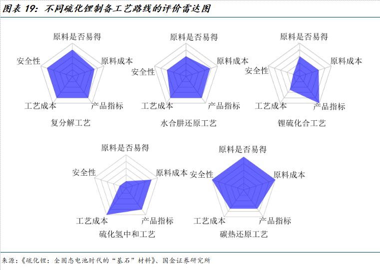 碳热还原、水合肼还原和复分解工艺路线的综合优势较为明显,产业化实践已进入工程验证阶段。在《硫化锂:全固态电池时代的“基石”材料》中基于产业化工程实施视角,以原料是否易得、原料成本、工艺成本、安全性和产品指标这五个方面对不同工艺路线的量产前景进行全面评价。对比来看,虽然锂硫化合工艺的产品指标最为突出,但安全性差且成本高,因而只是产业化早期实现小批量供应的主要路线;硫化氢中和工艺虽然成本和性能兼具,但原料难以获得且安全性较差;碳热还原、水合肼还原和复分解工艺这3条路线在原料、成本、安全和性能方面实现了较好的平衡。