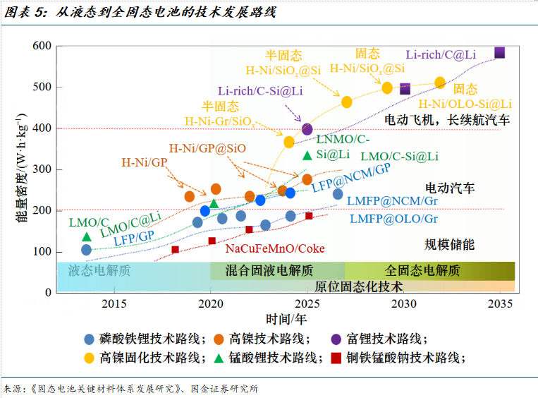 固态电池关键材料和制造技术的革新是实现从传统液态电池经原位固态化电池直至实现全固态电池的基础。在《固态电池关键材料体系发展研究》一文中提到了对我国固态电池发展关键时间点的规划建议,中期(2025-2030年)以目前国内已有的固态电池研发和量产能力基础,通过原位固态化技术,采用新材料,改造现有产线,优化现有技术体系,实现产品升级,提升电池的能量密度、安全性、一致性和寿命等关键指标,同步开展全固态电池及新电池体系的前瞻性研发,为全固态电池的规模化应用奠定科学和技术基础,满足新能源汽车、电动船舶、电动航空、规模储能、国家安全等战略需求;远期(2030-2035年)在原位固态化电池技术基础之上,加速全固态电池产业化,进一步提升全固态电池技术成熟度和应用领域,提升技术水平,降低电池全生命周期成本等要素,扩大产业规模和市场占有率,形成自主可控、可持续发展、绿色零碳的产业生态,拓展更广泛的应用领域,并扩展到极地、高寒地带、平流层、深空等国家战略特殊应用场景。