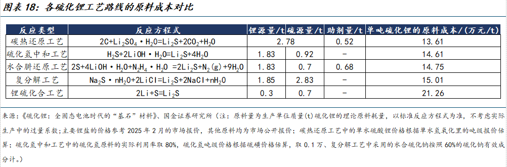 硫化锂合成前体选择的多样性衍生出不同的制备工艺路线,且不同路线的成本差距明显。由于硫、锂两种元素在自然界的赋存形态多元,因而在制备硫化锂时,锂源和硫源的选择具有显著多样性。锂源可分为两种,一种是强还原性锂源(金属锂或有机锂类),参与硫源的氧化还原反应,一般可和单质硫直接反应生成硫化锂;另一种是惰性锂源(如氢氧化锂等传统锂盐),仅作为锂供体,不参与氧化还原反应,一般需要和高活性硫化剂(如硫化氢,二硫化碳等)进行反应。具有双功能前体特性如硫酸锂能够同时提供锂源和硫源,通过碳热、镁热、铝热等除氧工艺实现硫价态调控,直接得到硫化锂。上述反应均遵循明确的热力学可行性路径,而动力学条件的改变如改变产物的浓度等方法,也可以促进硫化锂制备反应的正向进行,如硫化钠和无机锂盐的复分解反应,通过控制反应物以及产物的溶解度实现反应正向进行。《硫化锂:全固态电池时代的“基石”材料》中对各种路线的成本进行了对比测算,其中碳热还原路线展现出显著经济性优势,主要归因于硫酸锂的低价特性及其作为碳酸锂上游前体的产业定位优势;硫化氢中和工艺和水合肼还原工艺的原料成本构成类似,主要源于锂源一样;复分解工艺的核心原料水合硫化钠的价格较高;锂硫化合工艺由于使用了价格高昂的金属锂,所以锂硫化合工艺的原料成本远高于其他工艺。