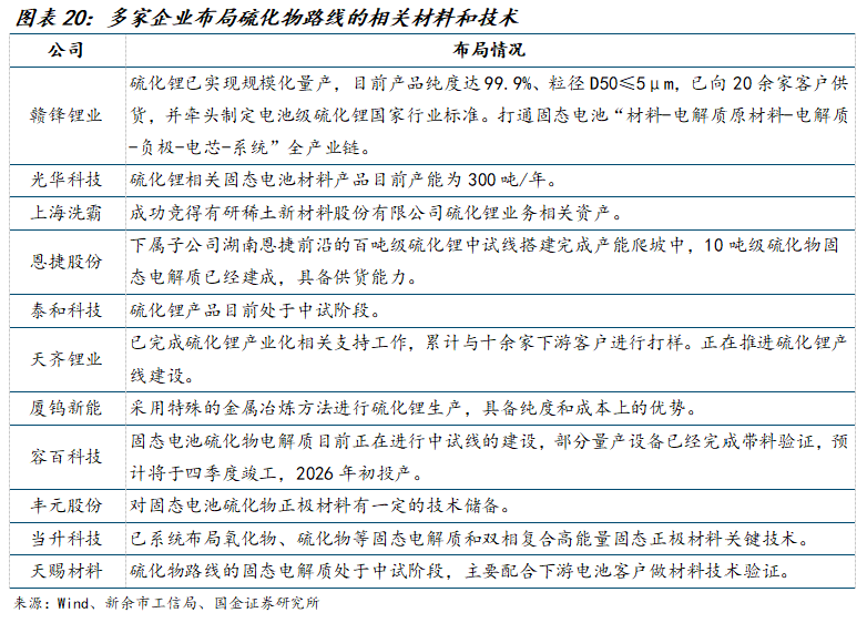 硫化锂为硫化物路线的核心材料,多家锂电材料相关企业开始重点布局。从布局时间来看,赣锋锂业布局相对较早,在2022年建成首条生产线,并于2024年产能再度扩张,目前公司产品纯度达99.9%、粒径D50≤5μm,已向20余家客户供货;目前产线建设节奏相对较快的有光华科技和恩捷股份,光华科技目前具备300吨的硫化锂相关固态电池材料产品产能,恩捷股份下属子公司湖南恩捷前沿的百吨级硫化锂中试线搭建完成目前产能爬坡中。天齐锂业、厦钨新能、泰和科技、容百科技、天赐材料等多家企业产品处于中试和下游验证阶段,此外上海洗霸也通过收购获得了有研新材旗下子公司有研稀土的硫化锂业务相关资产,从而实现对硫化物技术路线的核心材料布局。随着行业趋势逐渐清晰布局企业也开始变多,建议关注具备技术、成本和规模优势的企业。