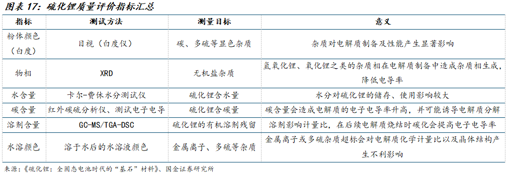 硫化锂的产品指标是后续硫化物固态电解质的合成工艺及产物性能的关键性制约要素。硫化锂中的杂质以无机锂盐杂质、碳杂质、金属元素杂质以及水分杂质等为主,因此纯度参数尤为关键。硫化锂的高纯度是实现硫化物固态电解质高性能的重要基础,目前行业内评价硫化锂产品水平主要聚焦白度、物相纯度、多硫含量、水分含量、以及碳杂质含量等角度。