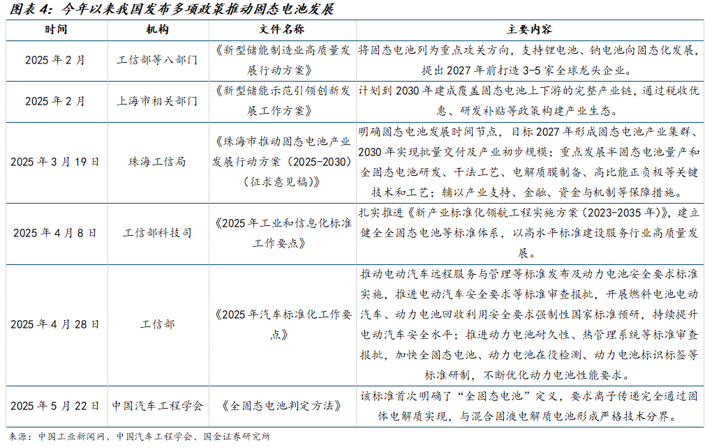 政策端已形成“中央政策定调+地方试点推进”的立体化支持体系。今年以来工信部和部分地区均已发布多个政策文件支持固态电池的长期发展,从发展的关键时间节点来看,工信部提出支持锂电池、钠电池向固态化发展,2027年前打造3-5家全球龙头企业;上海市相关部门提出计划到2030年建成覆盖固态电池上下游的完整产业链;珠海工信局明确固态电池发展时间节点,目标2027年形成固态电池产业集群、2030年实现批量交付及产业初步规模。