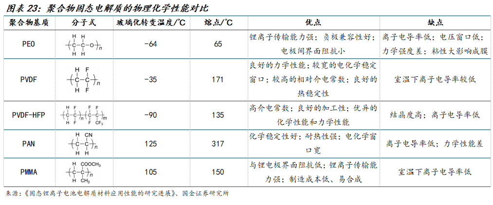 聚合物固态电解质主要由聚合物基体和锂盐组成,具有良好的柔韧性、轻量化、可扩展性、可机械加工性和界面相容性。常见的聚合物基体包括聚环氧乙烯(PEO)、聚偏氟二乙烯(PVDF)、聚偏氟二乙烯共六氟丙烯(PVDF-HFP)、聚丙烯腈(PAN)、聚甲基丙烯酸甲酯(PMMA)等。对比不同类型的聚合物固态电解质性能可以发现,聚合物电解质普遍具有良好的柔性和可加工性,适用于可穿戴设备等的固态电池;但空温离子电导率低,导致电池倍率性能及功率密度均较低;并且热稳定性较差,使其对电池工作温度的变化范围有较严格的要求;而且部分聚合物电解质的力学强度较低,当负极为锂金属时难以阻止锂枝晶生长。成本端来看,由于锂盐对湿度敏感,合成过程须在干燥条件下进行,一定程度地增加了生产成本。性能和成本的双重问题导致当前聚合物电解质在固态电池中的应用相对受限。