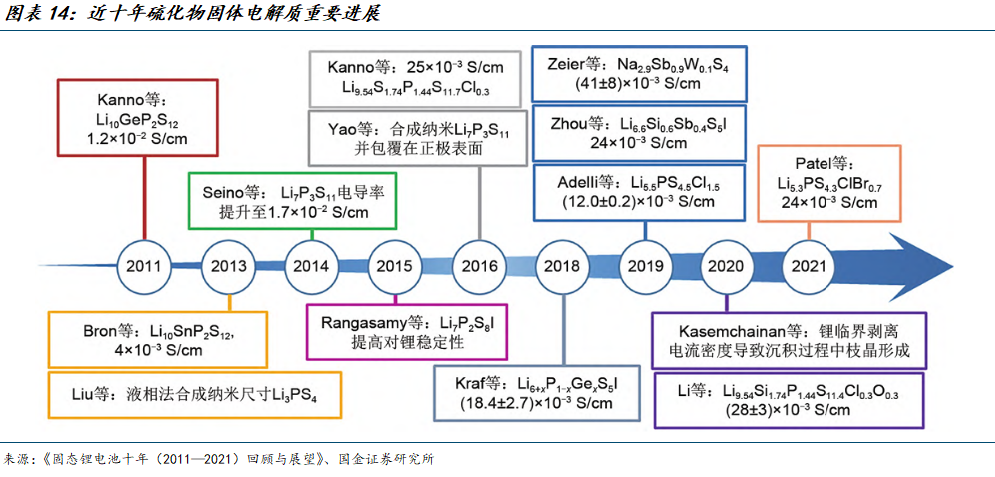 硫化物在固态电池的应用中展现了性能优势,未来发展潜力相对较大。硫化物固体电解质在室温下具有较高的离子电导率(10-4-10-2S/cm),接近甚至超过液态电解质的高离子电导率(10-3-10-2S/cm),同时还且具有可忽略的电子电导率和良好的力学性能,机械柔软易加工,界面阻抗较低,有利于全固态电池中电极/电解质形成良好的固-固接触界面,从而优化全固态电池的循环稳定性。虽然硫化物被认为是最有望率先实现商业化的全固态电解质之一,但仍然存在空气稳定性差、制备工艺难度大、批次性差、成本高等问题。因此,过去十来年期间,许多研究致力于开发出具有高离子电导率、宽电化学窗口,具有良好化学稳定性和空气稳定性的理想固体电解质材料。