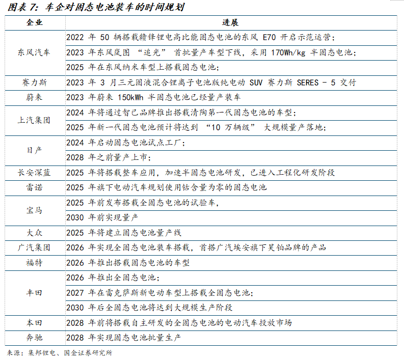 面对固态电池的产业趋势,多家车企对固态电池的装车时间进行了规划布局。在商业应用方面,东风、蔚来、赛力斯等车企已成功实现半固态电池的装车,甚至已经开始交付。与此同时,一些海外企业选择直接跳过半固态电池领域,直接投身全固态电池的研发和应用。大众、宝马、丰田、奔驰、日产等知名汽车品牌也规划在2025年至2030年期间推出搭载全固态电池的动力汽车。