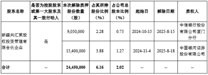 公司于近日收到本公司控股股东新疆兴汇聚股权投资管理有限合伙企业(以下简称“新疆兴汇聚”)关于将其持有的本公司部分股份办理了解除质押的通知。