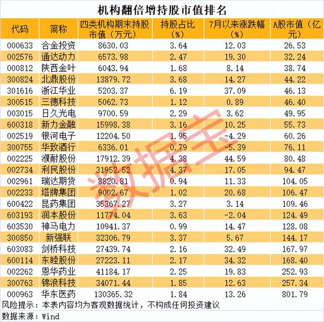 据统计,有23只股二季度机构(券商、社保、QFII、险资等四类)合计持仓翻倍且期末持股市值超过5000万元。