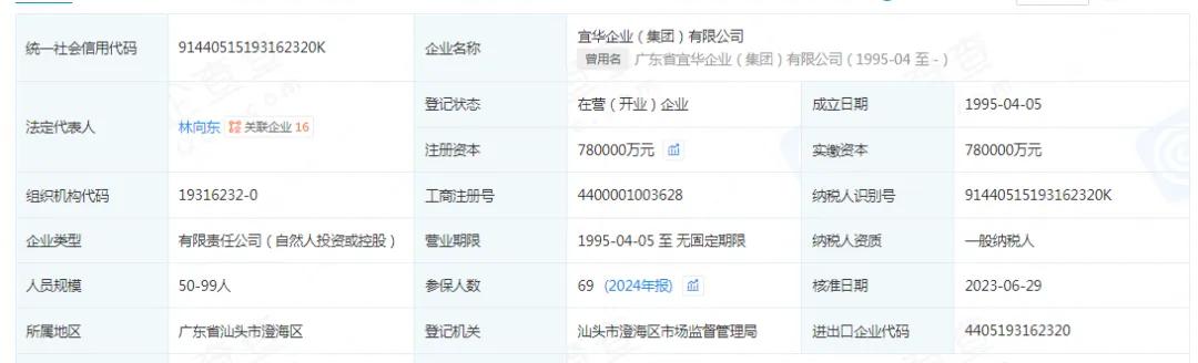企查查资料显示,宜华集团目前的法定代表人为林向东,公司股东有刘绍喜、汕头宜华世纪投资有限责任公司、刘壮青、刘绍生。