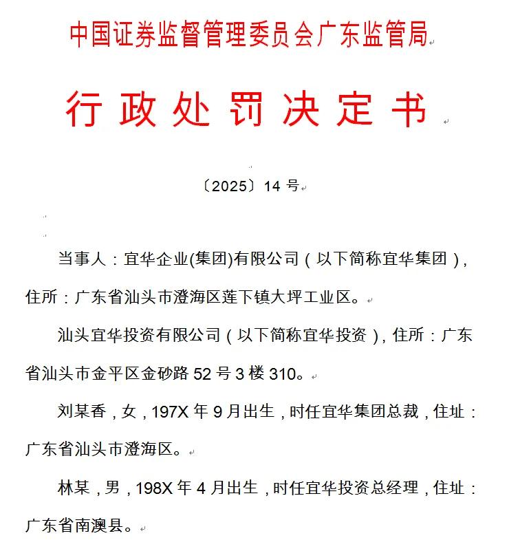 8月22日,广东证监局披露一则行政处罚决定书,对宜华企业(集团)有限公司(简称“宜华集团”)及其旗下的汕头宜华投资有限公司(简称“宜华投资”)等作出处罚。