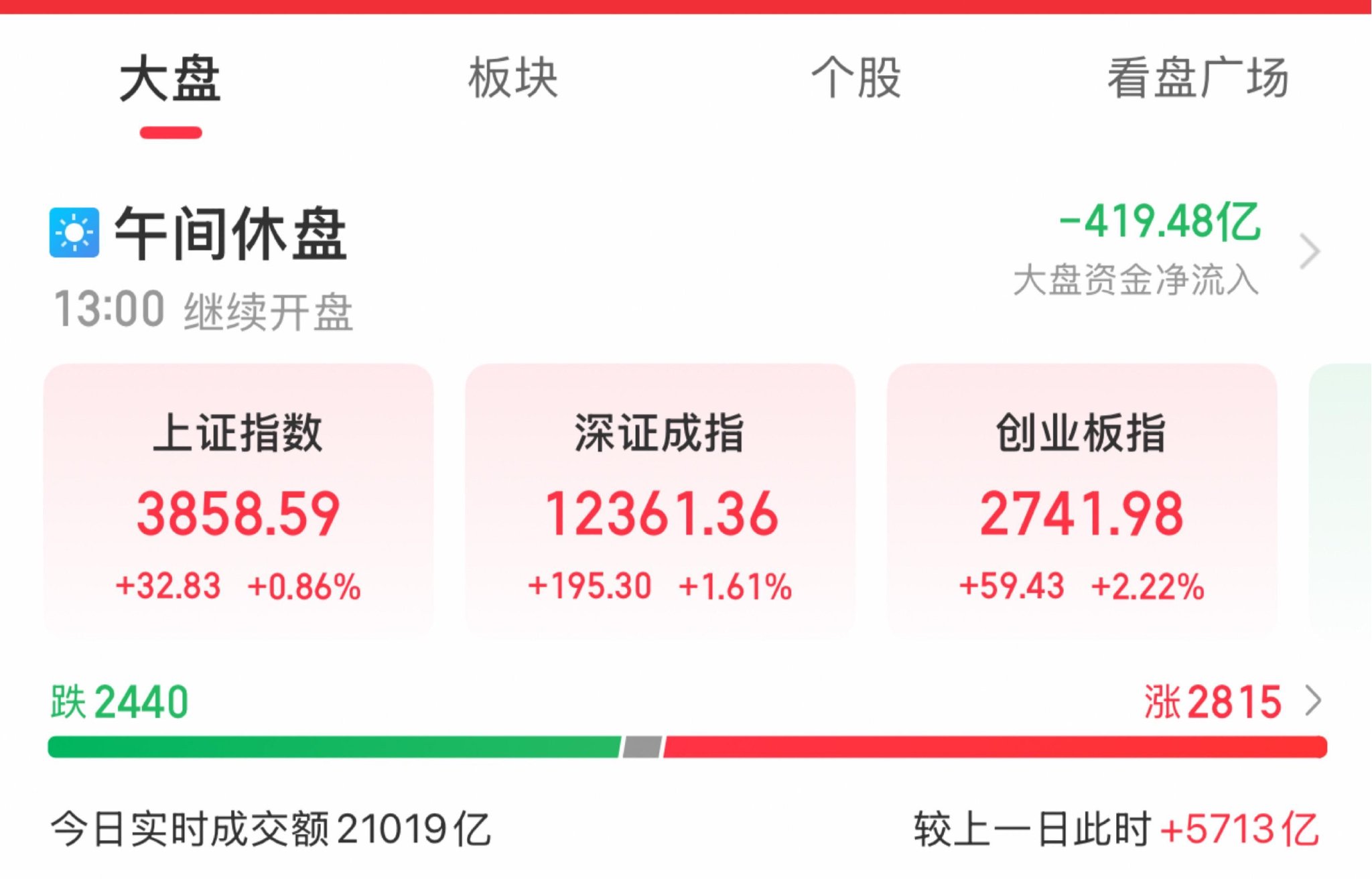 A股三大指数早盘集体上涨,截至午盘,沪指涨0.86%,深成指涨1.61%,创业板指涨2.22%,北证50指数跌0.21%,沪深京三市半日成交额21019亿元,较上日放量5713亿元。全市场超2800只个股上涨。