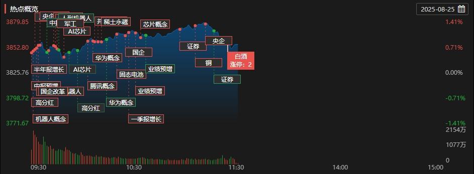 盘面上,AI硬件股早盘再度大涨,寒武纪升破1300元,海光信息市值突破5000亿元,新易盛(300502)、中际旭创(300308)盘中涨超10%再创新高。稀土有色板块全线爆发,金力永磁(300748)、北方稀土(600111)、中钢天源(002057)等股封板涨停。房地产板块集体反弹,万科A封板涨停,万通发展(600246)3连板。白酒股同步走强,舍得酒业(600702)涨停,水井坊(600779)、山西汾酒(600809)跟涨。全市场成交额早盘快速攀升,半个成交日已突破2万亿元。