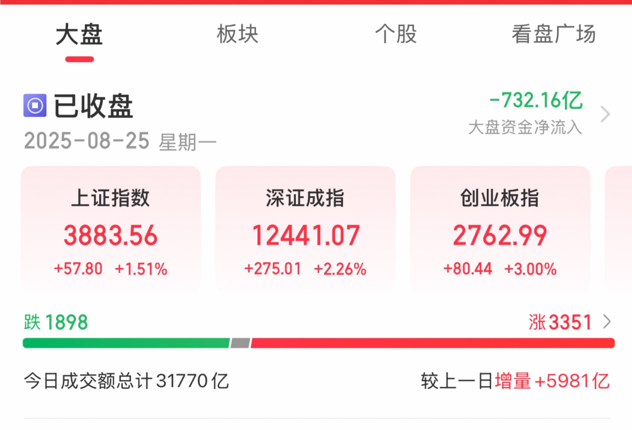 A股三大指数集体大涨,截至收盘,上证指数涨1.51%,深证成指涨2.26%,创业板指涨3%,北证50涨0.23%。沪深京三市全天成交额31770亿元,较上日放量5981亿元。全市场超3300只个股上涨。