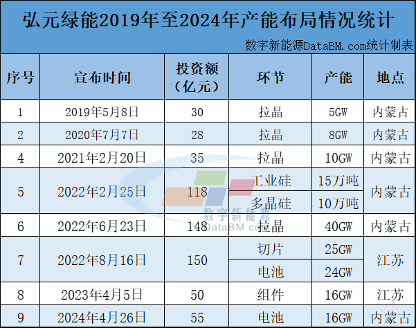 自2019年下半年至2024年,这近5年的时间,据数字新能源DataBM.com不完全统计弘元绿能仅布局自有产能就豪掷了614亿元,形成“硅料-硅片-电池-组件”完整一体化布局。