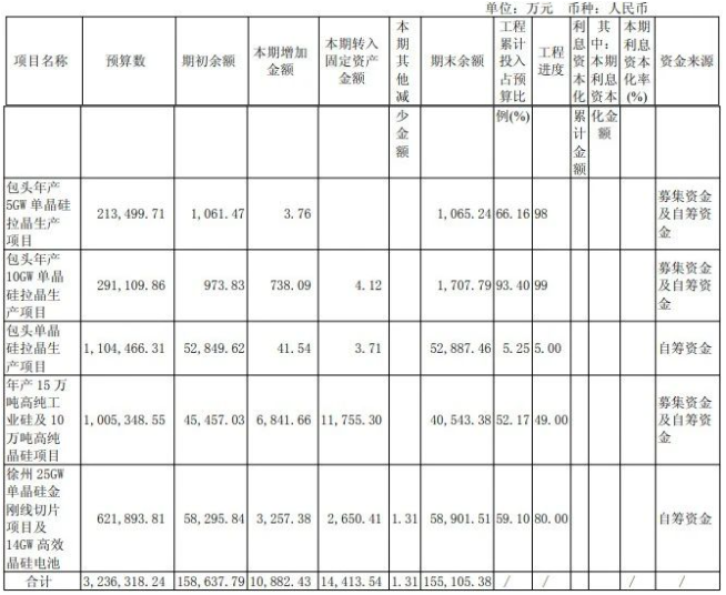 根据今年半年报显示,弘元绿能当前还有5个项目在建。其中包头单晶硅拉晶生产项目进度仅有5%,年产15万吨工业硅和10万吨高纯晶硅项目进展仅有49%。