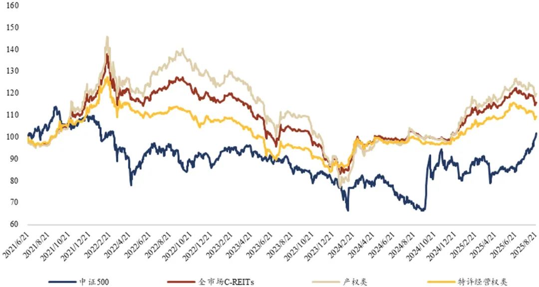3、从全市场阶段性表现看,上周权益市场走势强势,债市和C-REITs表现承压,至8月22日收盘C-REITs指数、产权类、特许经营权类较前一交易周分别下跌1.49%、下跌1.88%和下跌0.98%,同期中证500上涨3.87%,10年期国债指数下跌0.29%,C-REIT近期表现出和债市较强的相关性。