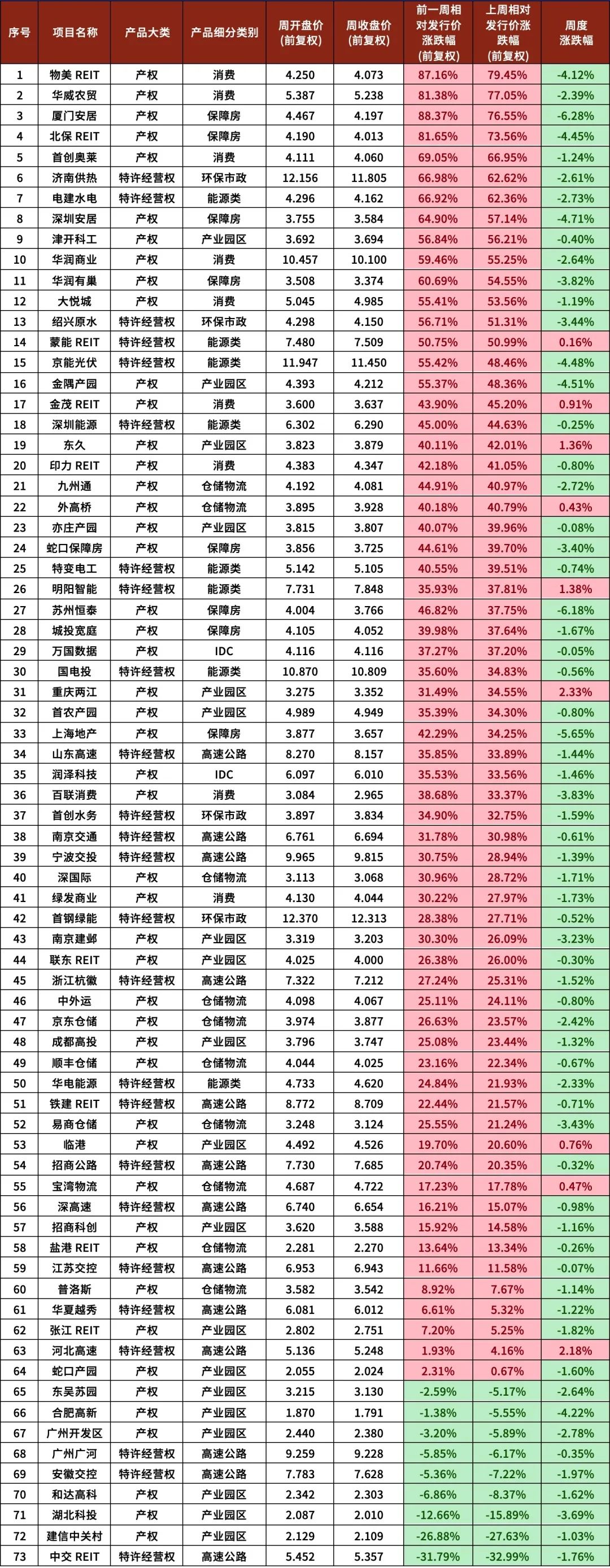 图表1 REITs价格涨跌幅汇总
