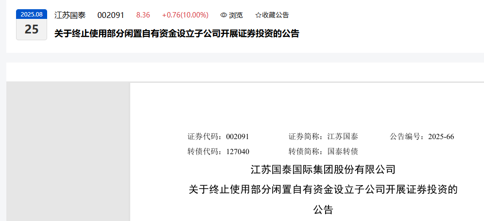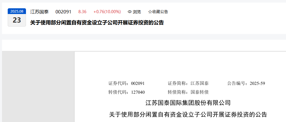 公司于2025年8月21日召开第九届董事会第二十一次会议,会议审议通过了《关于使用部分闲置自有资金设立子公司开展证券投资的议案》,同意公司及下属公司在充分保障日常经营性资金需求、不影响正常经营活动的前提下使用不超过人民币18.306亿元(含本数,或投资时点等值外币,相关额度由公司及公司并表范围内子公司共享)的闲置自有资金开展证券投资,其中公司子公司江苏国泰紫金科技发展有限公司(以下简称“紫金科技”)拟使用自有资金人民币15亿元的设立子公司进行证券投资。上述额度自董事会审议通过之日起12个月内有效,期限内任一时点的交易金额(含前述投资的收益进行再投资的相关金额)不超过证券投资额度。