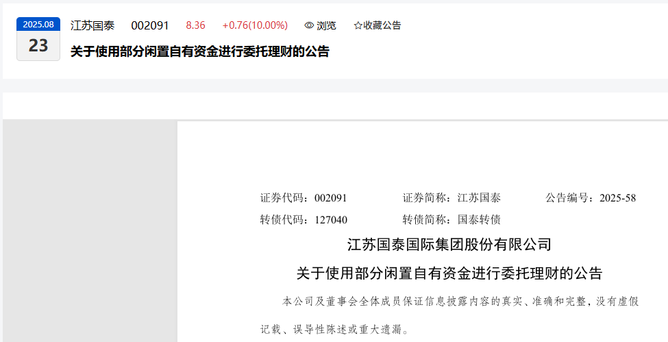 江苏国泰国际集团股份有限公司(以下简称“公司”)于2025年8月21日召开了第九届董事会第二十一次会议,审议通过了《关于使用部分闲置自有资金进行委托理财的议案》。公司董事会同意公司及下属子公司使用闲置自有资金进行委托理财的额度不超过人民币120亿元(含120亿元),用于购买安全性高、流动性好的中低风险理财产品,包括但不限于结构性存款、收益凭证、大额存单、国债逆回购等,单笔理财产品期限最长不超过36个月。在上述额度内,资金可以滚动使用,且任意时点进行委托理财的总金额(含前述投资的收益进行再投资的相关金额)不超过人民币120亿元,资金自股东大会审议通过之日起12个月内滚动使用。