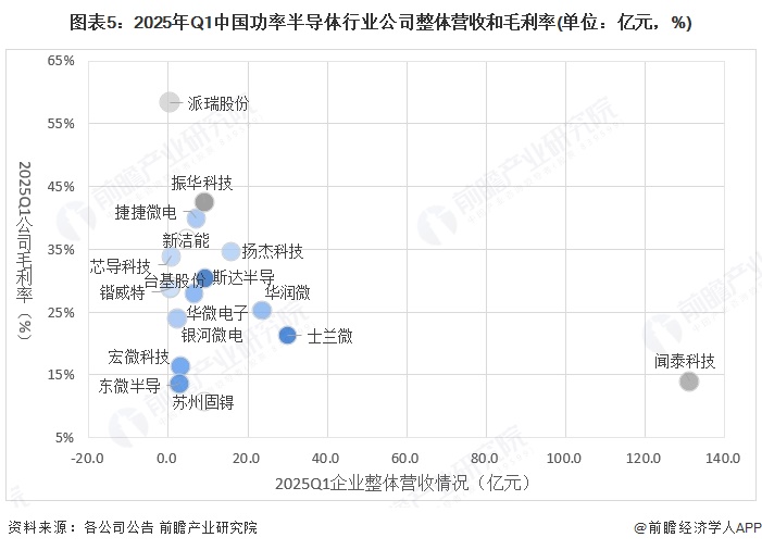从营收来看,大部分功率半导体2025年一季度的毛利率在10%-45%,整体来看盈利能力较好。这些企业营收集中在0-30亿元。营收方面,闻泰科技遥遥领先,2025年一季度已达到131亿元,但同比增速下降。毛利率方面,派瑞股份毛利率高达58.4%,几乎是行业中上市公司最高。公司在控制成本和提高效率处于行业领先地位。