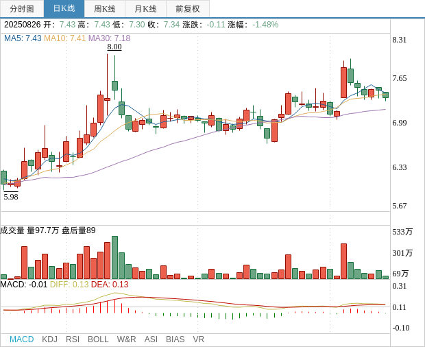 根据行情资料显示,在8月26日,天海防务的股价报收于7.34元/股,跌幅为1.48%。尽管当天股价有所波动,但在近七个交易日内,公司股价却上涨了2.66%。这种波动反映了市场对于公司未来发展的期待与不安,尤其是在其半年度报告发布后的短期内,投资者对公司的盈利能力持谨慎乐观态度,行业评价普遍认为天海防务具备良好的成长潜力。