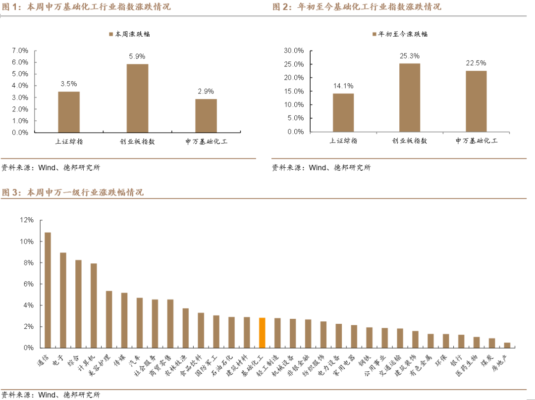 本周申万基础化工行业指数环比上涨。根据Wind,本周(8/15-8/22)上证综指涨跌幅为+3.5%,创业板指数涨跌幅为+5.9%;申万基础化工行业指数涨跌幅为+2.9%,在全部31个行业板块中位列第15位,跑输上证综指0.6个百分点,跑输创业板指数3个百分点。年初至今,上证综指涨跌幅为+14.1%,创业板指数涨跌幅为+25.3%;申万基础化工行业指数涨跌幅为+22.5%,跑赢上证综指8.4个百分点,跑输创业板指数2.7个百分点。