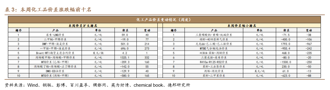 本周化工品价差涨幅前十名为:尿素-LNG价差(+40元/吨)、二甲醚-甲醇价差(+77元/吨)、DMF-甲醇-液氨价差(+214元/吨)、一甲胺-甲醇-液氨价差(+273元/吨)、Brent-WTI期货主连合约价差(+1美元/桶)、丙烯酸甲酯-丙烯酸-甲醇价差(+332元/吨)、MTO价差(乙烯-甲醇)(+160元/吨)、丙烯酸丁酯-丙烯酸-正丁醇价差(+55元/吨)、DMC-EO法价差(+40元/吨)、MTO价差(丙烯-甲醇)(+165元/吨)。