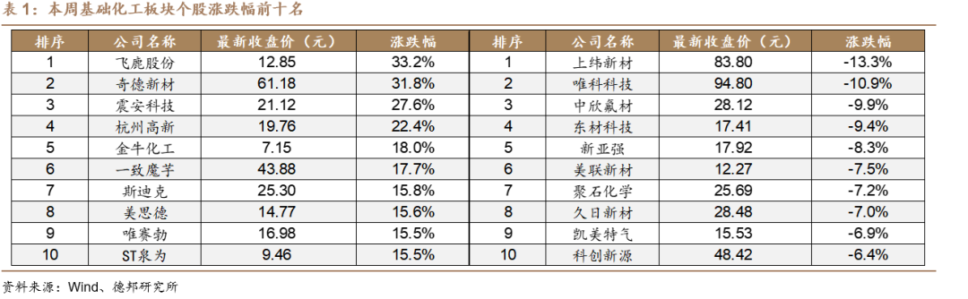 在基础化工板块424只股票中,本周327只股票上涨,96只股票下跌,1只股票持平。本周个股涨幅前十名分别为:飞鹿股份(+33.2%)、奇德新材(+31.8%)、震安科技(+27.6%)、杭州高新(+22.4%)、金牛化工(+18%)、一致魔芋(+17.7%)、斯迪克(+15.8%)、美思德(+15.6%)、唯赛勃(+15.5%)、ST泉为(+15.5%)。本周个股跌幅前十名分别为:上纬新材(-13.3%)、唯科科技(-10.9%)、中欣氟材(-9.9%)、东材科技(-9.4%)、新亚强(-8.3%)、美联新材(-7.5%)、聚石化学(-7.2%)、久日新材(-7.0%)、凯美特气(-6.9%)、科创新源(-6.4%)。
