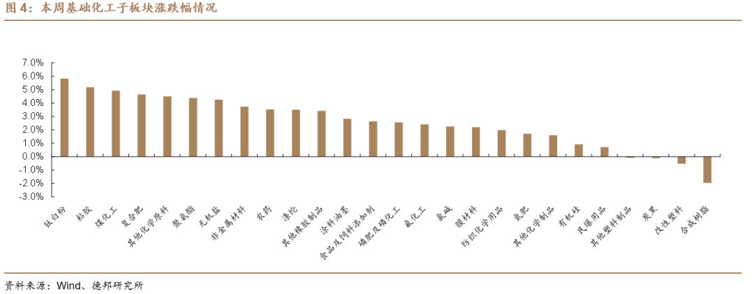 细分板块看,在基础化工26个子板块中,22个子板块上涨,4个子板块下跌。本周子版块涨跌幅前五名分别为:钛白粉(+5.8%)、粘胶(+5.2%)、煤化工(+4.9%)、复合肥(+4.6%)、其他化学原料(+4.5%);本周子版块涨跌幅后五名分别为:合成树脂(-2%)、改性塑料(-0.5%)、炭黑(-0.1%)、其他塑料制品(-0.1%)、民爆用品(+0.7%)。