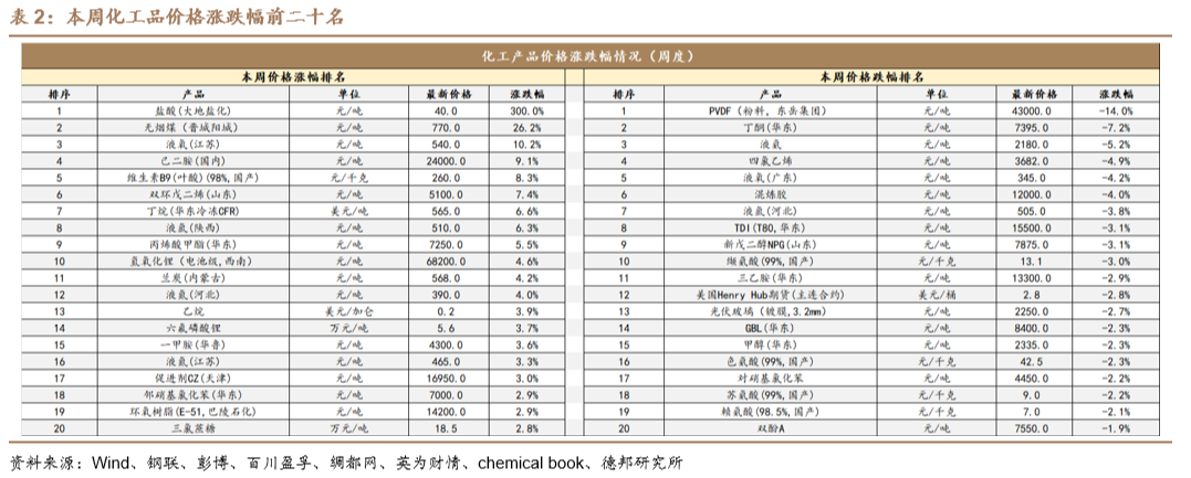 产品价格涨跌情况:本周(8/15-8/21)化工品价格涨幅前十名为:盐酸(大地盐化)(+300%)、无烟煤(晋城阳城)(+26.2%)、液氧(江苏)(+10.2%)、己二胺(国内)(+9.1%)、维生素B9(叶酸)(98%,国产)(+8.3%)、双环戊二烯(山东)(+7.4%)、丁烷(华东冷冻CFR)(+6.6%)、液氩(陕西)(+6.3%)、丙烯酸甲酯(华东)(+5.5%)、氢氧化锂(电池级,西南)(+4.6%)。本周(8/15-8/21)化工品价格跌幅前十名为:PVDF(粉料,东岳集团)(-14%)、丁酮(华东)(-7.2%)、液氨(-5.2%)、四氯乙烯(-4.9%)、液氧(广东)(-4.2%)、混炼胶(-4%)、液氩(河北)(-3.8%)、TDI(T80,华东)(-3.1%)、新戊二醇NPG(山东)(-3.1%)、缬氨酸(99%,国产)(-3%)。