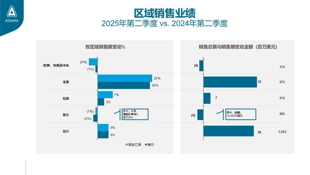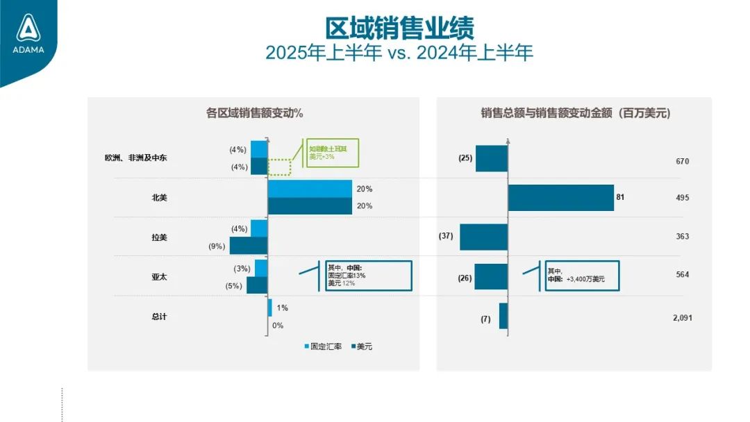 中国第二季度和上半年销售额均实现同比增长。其中,在氯碱市场向好的带动下,非农业务销售额同比增长,同时运营效率提升推动利润率改善。原药销售额亦同比增长,公司大力拓宽销售渠道推动业务增长,全球市场需求逐步复苏也对原药销售产生助力。国内品牌制剂业务则受到市场竞争对价格与销量的不利影响。