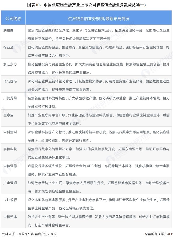 供应链金融产业上市公司业务规划上看,有不同的方向,例如联易融、中科金财等科技驱动型企业聚焦区块链将与AI技术联动,深化供应链金融平台的技术赋能;怡亚通、浙商中拓等产业整合型持续拓展大宗商品与新能源产业链服务;长沙银行、中粮资本强化区域化产融结合与绿色金融创新。下面是各家企业的发展规划: