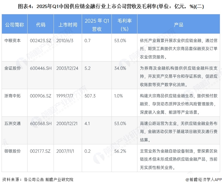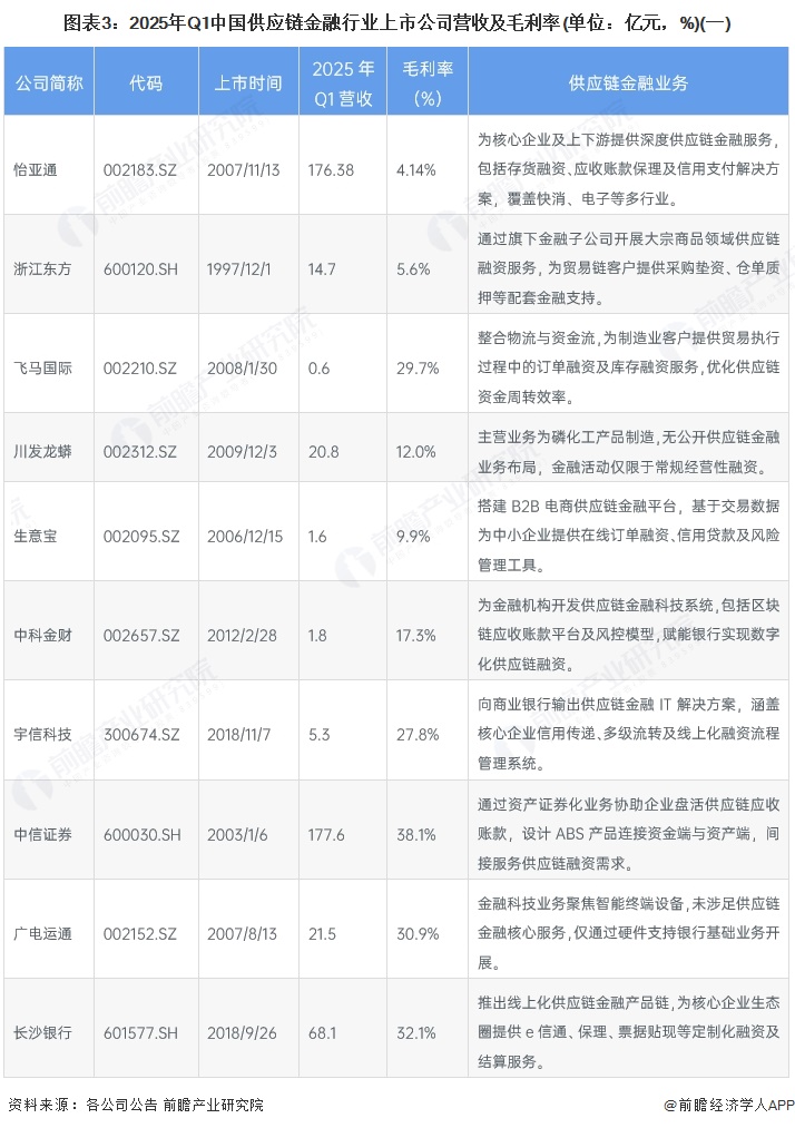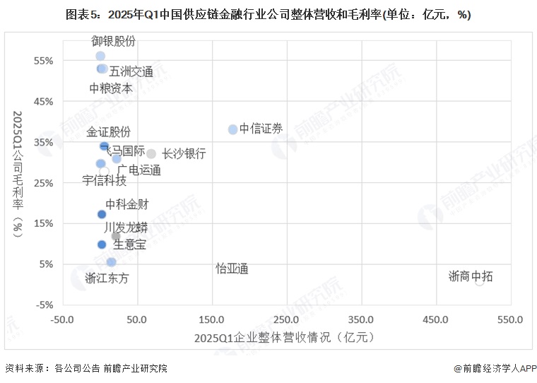 从营收来看,大部分供应链金融2025年一季度的营收较低,只有浙商中拓突破了500亿元,其次是百亿元的怡亚通和中信证券,两家企业的供应链金融经营情况较好。从一季度的毛利率来看,大部分企业经营较好,突破50%的有中粮资本、五洲交通以及御银股份。这些企业营收规模一季度低于5亿元,有较好的成本管控能力。从供应链金融业务来看,上市公司呈现三类主导模式:怡亚通、浙商中拓等深度整合产业场景提供闭环融资服务;生意宝、中科金财以科技平台驱动数据化风控与融资;长沙银行等金融机构依托信贷产品支撑链条周转。技术赋能与产业协同为核心竞争力,实体服务薄弱企业未涉足该领域。