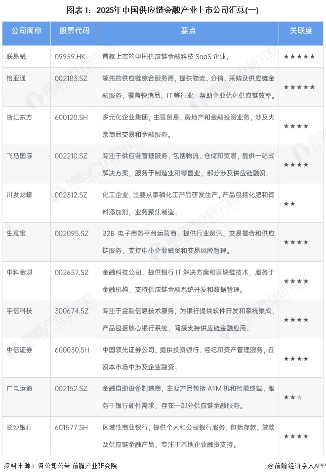 供应链金融题材强相关的企业主要有联易融、怡亚通、生意宝、中科财信等,大部分是银行等大型金融机构,在严格的监管下,行业上市公司较少。核心服务商如怡亚通、浙商中拓及长沙银行深度整合供应链金融业务,提供全流程解决方案;技术赋能型公司如生意宝、中科金财通过平台与系统开发间接支持融资服务;而传统制造及基建企业如川发龙蟒、五洲交通则关联度最低。整体以服务实体产业为核心,金融科技企业侧重系统支撑,商业银行聚焦融资落地,技术驱动成为关键发展要素。