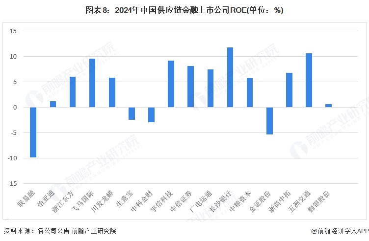 2024年供应链金融行业企业ROE表现整体一般,盈利企业中长沙银行以11.81%居首,五洲交通、飞马国际、宇信科技等紧随其后,金融和交通领域优势显著;亏损企业中联易融ROE为-9.86%,金证股份、中科金财等亦呈现负增长,主要受资产减值及行业调整影响。整体来看,高ROE企业多集中于金融和交通行业,部分科技类企业面临盈利压力。